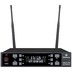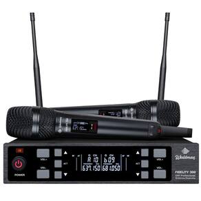 Microfone Duplo sem Fio Waldman Fidelity 300 modedo WFD-300/614. Características: - Case de alumínio - Duas extensões de frequências - 150 frequências por canal - Até 100 metros der distância da base em ambiente aberto - Cápsula dinâmica especialmente customizada - Pareamento de frequências por infravermelho IR der alta qualidade - Função Scan - Estabilidade de frequência - Tecnologia anti-interferência TAI - Alta estabilidade e transmissão Especificações Técnicas: - Alcance de frequência: 1 Modelo WFD-300/530 - 599,90 MHz 2 Modelo WFD-300/614 - 676,12 MHz - Modo de modulação: FM - Faixa Desviante Máxima: +/- 50 KHz - Respostas AF: 100 Hz - 10 KHz - Relação sinal/ruído: 50dB - Sensibilidade: 105dB - T.H.D.: 5% 1KHz - Processamento AF: Compressão dinâmica e tecnologia de extensão : - Oscilação: PLL sintetizado - Nível de saída AF: 0-300 mv - Impedância de saída AF: 600 O - THD: 85dB Transmissor: - Oscilação: PLL sintetizado - Estabilidade de frequência: +/-10ppm - Regulação máxima: +/-50 KHz - Potência de saída máxima: 130 dB SPL - Tipo de dinâmico portátil , condensador lapela e ganso - Bateria: tamanho AA Homologação Anatel: 164712304809