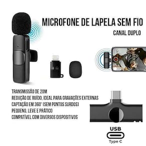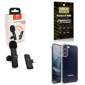 Microfone Sem Fio Profissional com presilha Tipo C H'maston O Microfone Sem Fio Profissional com presilha Tipo C H'maston de alta sensibilidade com captação de áudio 360 graus, possui resposta rápida para que você grave todos os detalhes de som Qualidade de som pura, comparável a uma equipe de gravação profissionalEste Microfone Sem Fio H'Maston MK-04 Wireless 360 com Interface USB-C para SmartPhone e Tablets Android, além de PC com entradas USB-C Type-C , possui uma alta qualidade de som, é portátil e muito fácil de usar, sendo Plug and play apenas colocar em seu smartphone e usar. O Sistema Wireless de Microfone Lapela para Equipamentos USB-C possui Bateria Interna com duração de até 10 horas e trabalha com uma distância de até 20m. O Microfone Sem Fio Profissional com presilha Tipo C H'maston é emparelhado automaticamente imediatamente após a conexão, sem necessidade de aplicativos, sem fios irritantes, sem depuração, apenas conexão instantânea Principais Características: Plug and play, conexão de um clique, fácil de usar. Áudio limpo e preciso e mão livres ao gravar Conector USB-C para SmartPhone e Tablets Android Captação de áudio sem ponto cego de 360 grau Latência muito baixa de 9 milissegundos Alcance de até 20 metros em locais sem obstáculos Função antirruído do circuito de redução de ruído Bateria Interna com duração de até 10 horas Qualidade de som pura e alta sensibilidade Compatível com uma variedade de dispositivos Adequado para todos os tipos de transmissão ao vivo, gravação, entrevista, gravação de vídeo, Vlogs, Youtubers, aulas online e muito mais.-------------Película de Vidro 3D Blindada - ArmyshieldA película de vidro 3D para celular é um produto de alta qualidade que oferece proteção e estilo para o seu dispositivo móvel. Feita de vidro temperado de alta resistência, a película é projetada para se encaixar perfeitamente na tela do seu celular, proporcionando uma cobertura completa e proteção contra arranhões, rachaduras e outros danos.A película de vidro 3D é especialmente projetada para se curvar suavemente ao redor das bordas do seu celular, criando uma aparência elegante e sem bordas. Isso significa que você pode desfrutar de uma experiência de visualização imersiva e sem interrupções, sem se preocupar com a película descolando ou interferindo na sensibilidade da tela.Atenção: O produto acompanha apenas o que apresenta na imagem.