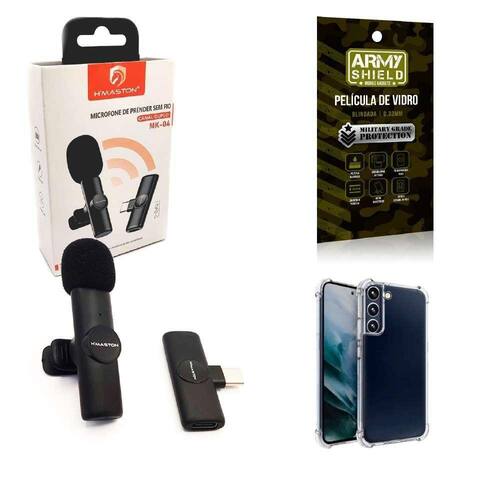Microfone Sem Fio Profissional com presilha Tipo C H'maston O Microfone Sem Fio Profissional com presilha Tipo C H'maston de alta sensibilidade com captação de áudio 360 graus, possui resposta rápida para que você grave todos os detalhes de som Qualidade de som pura, comparável a uma equipe de gravação profissionalEste Microfone Sem Fio H'Maston MK-04 Wireless 360 com Interface USB-C para SmartPhone e Tablets Android, além de PC com entradas USB-C Type-C , possui uma alta qualidade de som, é portátil e muito fácil de usar, sendo Plug and play apenas colocar em seu smartphone e usar. O Sistema Wireless de Microfone Lapela para Equipamentos USB-C possui Bateria Interna com duração de até 10 horas e trabalha com uma distância de até 20m. O Microfone Sem Fio Profissional com presilha Tipo C H'maston é emparelhado automaticamente imediatamente após a conexão, sem necessidade de aplicativos, sem fios irritantes, sem depuração, apenas conexão instantânea Principais Características: Plug and play, conexão de um clique, fácil de usar. Áudio limpo e preciso e mão livres ao gravar Conector USB-C para SmartPhone e Tablets Android Captação de áudio sem ponto cego de 360 grau Latência muito baixa de 9 milissegundos Alcance de até 20 metros em locais sem obstáculos Função antirruído do circuito de redução de ruído Bateria Interna com duração de até 10 horas Qualidade de som pura e alta sensibilidade Compatível com uma variedade de dispositivos Adequado para todos os tipos de transmissão ao vivo, gravação, entrevista, gravação de vídeo, Vlogs, Youtubers, aulas online e muito mais.-------------Película de Vidro 3D Blindada - ArmyshieldA película de vidro 3D para celular é um produto de alta qualidade que oferece proteção e estilo para o seu dispositivo móvel. Feita de vidro temperado de alta resistência, a película é projetada para se encaixar perfeitamente na tela do seu celular, proporcionando uma cobertura completa e proteção contra arranhões, rachaduras e outros danos.A película de vidro 3D é especialmente projetada para se curvar suavemente ao redor das bordas do seu celular, criando uma aparência elegante e sem bordas. Isso significa que você pode desfrutar de uma experiência de visualização imersiva e sem interrupções, sem se preocupar com a película descolando ou interferindo na sensibilidade da tela.Atenção: O produto acompanha apenas o que apresenta na imagem.