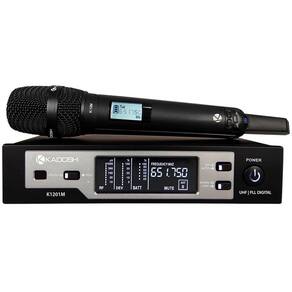 Microfone Sem Fio Kadosh Kdsw-1201M Microfone único sem fio UHF destinado ao uso em médios e grandes eventos para locução e canto. Capacidade de operação de até 8 sistemas do mesmo modelo desde que o usuário atenda as regras de uso do produto - Não colocar as bases em cima da outra, não cruzar as antenas de outras bases, dar uma distância mínima necessária de 7 cm de cada base, fazer coordenação de frequências - aconselha-se 6Mhz.