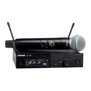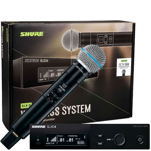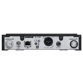 Cada sistema inclui um de um canal SLXD4, um transmissor de mão SLXD2/B58, antena, acessórios para instalação em rack e 2 pilhas AA.
