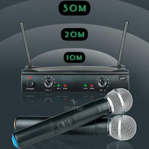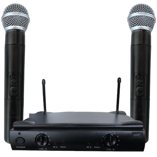 O microfone sem fio duplo profissional é um sistema de captação de áudio que inclui dois microfones individuais, ambos operando sem a necessidade de fios físicos para se conectar ao receptor. Sistemas projetado para oferecer maior flexibilidade e liberdade de movimento aos usuários em ambientes profissionais, como palcos de teatro, shows, eventos corporativos, apresentações ao vivo, entre outros.
