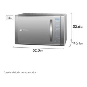 Espelhado, com Painel Touch On Glass, Função Grill , Display LCD, Grill e 3 níveis de potênciaMicro-Ondas ME41X com painel Touch On Glass e Função Grill Destaques Painel Blue Touch Um lindo e elegante painel de vidro espelhado, cujas funções se acendem e são acionadas com um simples toque no painel Porta Espelhada Pequeno detalhe que confere mais beleza para o micro-ondas. Deixe sua cozinha ainda mais charmosa Função Grill Doura os alimentos, dando um toque a mais nas receitas Interior em Aço inox Durabilidade e facilidade de limpeza Tira odor Seu micro-ondas limpo e sua cozinha agradável QRCODE Video com passo a passo das receitas dos menus Menu dia-a-dia Prepara as receitas mais usadas como arroz, macarrão e batata Menu Kids Prepara as receitas prediletas das crianças como bolo de caneca, Pipoca e brigadeiro Menu Descongelar Com apenas um toque descongela carne, frango, peixe e feijão Função Potência / Porção Escolha a quantidade do alimento para o cozimento e a potência ideal Painel Numérico É só apertar o tempo desejado para acionar o funcionamento do micro-ondas Função Mudo Aperte a tecla 0 por 4 segundos e o som do bip desaparece Desliga Display Economia de energia, desligue o painel digital quando terminar de usar o aparelho Relógio Facilidade no ajuste da hora Trava de segurança Função que permite travar o aparelho quando você quiser. Ideal para evitar que crianças ou pessoas não autorizadas possam acioná-lo 10 níveis de Potência São diversos ajustes de potência para cozinhar em seu micro-ondas Início +30s Inicia e pausa o programa ou tempo selecionado Características Tipo: De mesa Função Grill Painel Eletrônico Touch On Glass Pratos Pré-programados: Menu dia-a-dia, Menu Kids, Menu Descongelar Favoritos: Menu dia-a-dia Timer Especificações Técnicas Modelo: ME41X Cor: Prata Capacidade Total: 31 litros Capacidade Útil: 18 litros Potência: 1550 W Nível de Potência: 10 Consumo de Energia: 0,02 kwh/mês Selo Procel Eficiência Energética : B Acabamento: Porta espelhada + e acabamento na cor prata Porta Espelhada Prato Giratório Luz Internar Relógio Voltagem: 110V ou 220V não é bivolt EAN: 7896584076424 110V / 7896584076431 220V : 12 meses Dimensões e Peso Dimensões do produto sem embalagem AxLxP : 325x530x450 mm Dimensões do produto com embalagem AxLxP : 355x555x480 mm Peso do produto sem embalagem: 15,2 kg Peso do produto com embalagem: 15,8 kg Marca: Não Informado