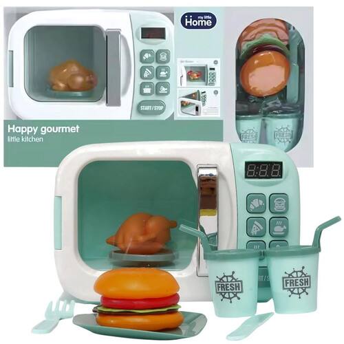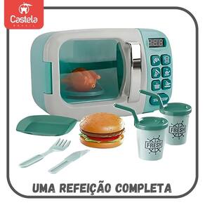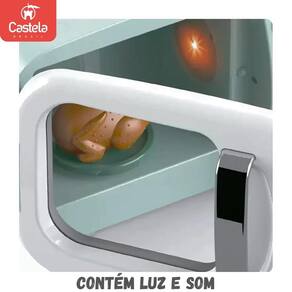 Inclui: micro-ondas infantil com luz e som, além de acessórios de cozinha.