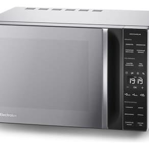 Micro-ondas de bancada com capacidade de 23 litros e potência de 1100W. Fabricado em aço, plástico e vidro com acabamento inox. Possui puxadores embutidos. Não possui função grill.Função Grill