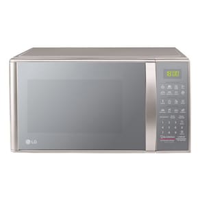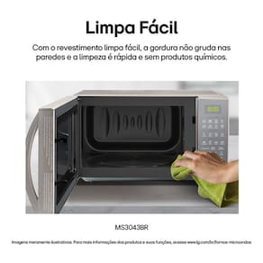 Micro-ondas de bancada LG 30L, 127V, 1250W, dimensões 50,8x29x40cm, ideal para cozinhas com espaço limitado. Construído em metal, plástico e vidro, com puxador externo.Função Grill