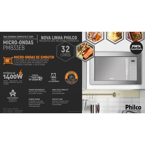 Informações Técnicas - Marca Philco - Modelo PMB33EB - Capacidade 32 litros - Tipo de Embutir - Cor/Acabamento Prata com frente espelhada - Composição Metal, Vidro e Plástico - Prato Giratório 27cm - Voltagem 110v ou 220v (não é bivolt) - Potência 1400w - Consumo aproximado de energia 1,4 kwh/m - Eficiência Energética Classe A