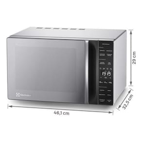 Micro-ondas de bancada com capacidade de 23 litros, cor inox, acabamento em aço, plástico e vidro. Potência de 1100 W, tensão elétrica de 220V, descongelamento assistido. Dimensões: 29 cm (A) x 46,1 cm (L) x 35,2 cm (P). Puxador embutido.Função Grill