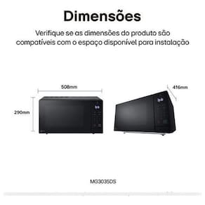 Micro-ondas LG 30 Litros Grill com painel touch, função Grill, 10 níveis de potência, função Adicionar 30 Segundos, Bloqueio Infantil, Bipe de Conclusão, Limpa Fácil, Ajuste de Hora, Relógio, Indicador de Porta Fechada, Auto Cozimento, Descongelar, Luz LED na cavidade, Design da porta fumê.Função Grill