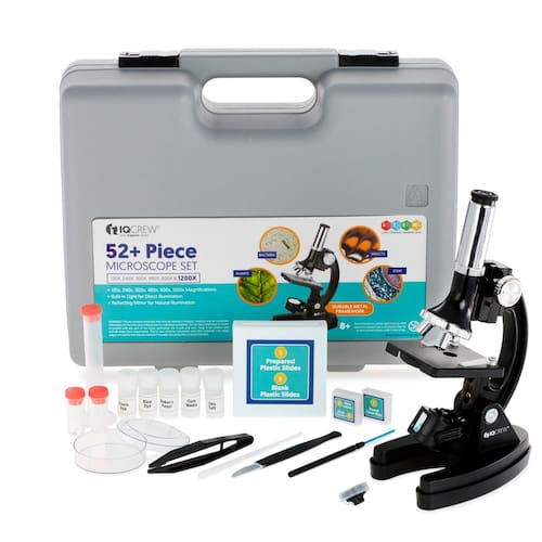 AmScope - Kit de microscópio infantil M30-ABS-KT2, armação de metal, 120X, 240X, 300X, 480X, 600X e ampliações de 1200X, 2 oculares e 49 acessórios e estojo - O microscópio composto para iniciantes oferece alta ampliação para aplicações educacionais - Cabeça de visualização monocular com iluminação LED e espelho e roda de filtro de cor embutida - A torre rotativa voltada para frente oferece ampliação de 300x, 600x e 1200x - O foco coaxial grosso tem um mecanismo de foco de cremalheira e pinhão em uma estrutura de metal preto durável e resistente a manchas - Vem com kit de acessórios de 49 peças e estojo plástico ABS rígido