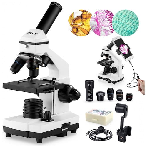 Ocular de alta ampliação WF25X sozinha ou com lente 2X, cooperar 4x 10x 40x lentes objetivas, microscópios biológicos oferecem 6 configurações de ampliação, 100X, 250X, 1000X, 200X, 500X, 2000X. Microscópios monoculares de foco grosso e fino com estrutura de metal sólido e botões de foco fino grosso garantem detalhes e ajuste preciso do foco, criando uma imagem mais clara e nítida. Sistema de Iluminação Dupla LED superior e inferior simultaneamente em campo claro, um condensador de lente única de 0,65 NA com diafragma de disco, fornece imagens com correção de cores de alta resolução. Acessórios completos Ele vem com adaptador de telefone, obturador de fio, 10 acessórios operacionais, conjunto de lâminas de microscópio de 15 peças, bolsa de transporte. Atenda a todas as suas necessidades de observação biológica. Ferramenta educacional prática Este microscópio biológico 100X 2000X foi projetado para ajudar estudantes, crianças, adultos, iniciantes, cientistas amadores, amadores, explorando o fantástico mundo da vida. É ideal para escola, laboratório ou ensino em casa, uma a uma instrução.