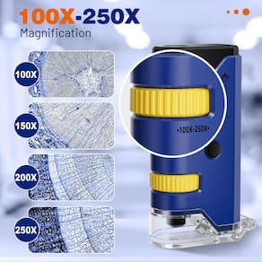 O mini microscópio de bolso oferece ampliação de 100 a 250 vezes, você pode ver claramente mais detalhes das células, atende a várias necessidades de observação de ampliação de pequenos cientistas/crianças/adultos para explorar o mundo microscópico. - ?Alta ampliação?O mini microscópio de bolso oferece ampliação de 100 a 250 vezes, você pode ver claramente mais detalhes das células, atende a várias necessidades de observação de ampliação de pequenos cientistas/crianças/adultos para explorar o mundo microscópico. - ?Design exclusivo?O miniscópio portátil com base deslizante dobrável exclusiva, aplica design refletor estriado prismático profissional e design fosco antirreflexo, fácil de colocar slides de microscópio e posicionar amostras, oferece imagens corrigidas por cores de alta resolução. - ?Explore e compartilhe?O mini microscópio de bolso vem com um adaptador de telefone, você pode conectá-lo e usar a câmera do telefone para tirar fotos e gravar vídeos, capturar a beleza do microcosmo biológico e compartilhá-lo com seus amigos ou familiares. - ?Tamanho do bolso?O microscópio portátil cabe facilmente no seu bolso, mede apenas 6 x 3 x 11 cm, pesa apenas 0,1 kg. Você pode levar o miniscópio para a escola, mini labsters ou ao ar livre e observar o mundo microscópico a qualquer hora, em qualquer lugar. - ?Estrutura óptica profissional? Ao contrário de outros mini microscópios de bolso, é feito de vidro óptico de alta qualidade, combinado com foco contínuo preciso, garante excelente desempenho óptico e qualidade de imagem. - ?Luz LED e UV?Miniscópio portátil com luz LED integrada avançada e luz UV, alimentado por uma bateria AA (não incluída). A luz LED oferece luz suficiente para ver imagens nítidas e nítidas mesmo com pouca luz. A luz UV é adequada para observar selos, notas e objetos fluorescentes, etc. - ?Fácil de usar?Contém 5 lâminas de microscópio de biologia preparadas. Depois de instalar as baterias, você pode explorar imediatamente o mundo microscópico. É o mini kit de microscópio de bolso ideal para educação em laboratório de ciências! - ?Capa de EVA durável? Vem com estojo de armazenamento de EVA projetado para microscópio portátil portátil, protegendo-o de arranhões e batidas, adequado para transporte ao ar livre e loja doméstica. - ?Presentes de microscópio científico?O mini microscópio de bolso 100 x 250 x é adequado para crianças/pequenos cientistas/estudantes aprenderem biologia, exploração da natureza ao ar livre, mini hobbies científicos, também adequado para adultos observarem moedas, notas, selos, cabelo, lâminas de microscópio, joias. - ?Você pode receber!? Inclui 1 miniscópio portátil, 1 adaptador de telefone, 5 slides biológicos preparados, 1 capa de EVA, 1 alça de pulso, 1 lenço de escopo, 1 manual de instruções (sem garantia de versão em português).