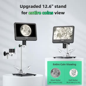 -?Microscópio de moedas IPS de 10,1 polegadas para visualização completa?Tela grande IPS de 10,1 polegadas, a distância máxima de visualização de 10,2 polegadas. O coletor de moedas pode ver as moedas completas ou as moedas de erro e obter o total e todos os detalhes das moedas. Dólar de prata (38,1 mm), meio dólar (30,61 mm), quartos (25,26 mm), uso multiuso para visualizar moedas ou peças inteiras, lâminas de microscópio, solda de PCB, Reparação de relógios, plantas, pedras, etc