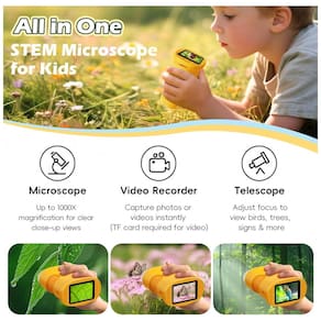 O equipamento possui formato compacto e leve, adequado para crianças, com pegada ergonômica para uso com uma das mãos e alça de pescoço para transporte. A função 3 em 1 permite uso como microscópio para observação aproximada, como espécie de telescópio digital para objetos mais distantes, além de gravação de fotos e vídeos quando utilizado com cartão TF.?