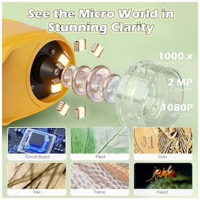 Microscópio digital infantil portátil com aumento de até 1000x e tela integrada em alta definição 1080P, projetado para visualização de detalhes de objetos do dia a dia, como insetos, folhas, tecidos, pele e moedas. A iluminação é feita por LEDs integrados, oferecendo cores nítidas e boa definição de imagem para exploração visual em diferentes ambientes.?