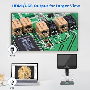 -?Suporte de atualização para um espaço de trabalho maior?O suporte principal tem 33 cm de altura e oferece um grande espaço de trabalho. O suporte secundário permite que os usuários ajustem a altura e as ampliações com mais precisão, o que é especialmente bom para observar peças pequenas. O braço da lança pode ser ajustado vertical e horizontalmente. Mesmo que a placa de circuito seja grande, o microscópio ainda é capaz de capturar imagens de todas as partes da placa