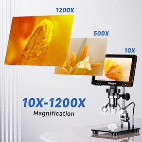 - Ampliação de 10-1200X: o microscópio de solda TOMLOV DM9 Pro oferece resolução fotográfica de 16 MP para imagens de alta qualidade. Com ampliação de 10x a 1200x, ele revela detalhes finos, ideais para peças pequenas. A ampliação é ajustada pela distância entre a lente e o objeto