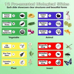 - 12 slides extras e presente perfeito: Inclui 12 slides de plástico cuidadosamente selecionados cobrindo quatro categorias: plantas, vegetais, insetos e animais. Cada slide apresenta estruturas claras e belas formas, combinando educação com diversão. Este conjunto de brinquedos de microscópio infantil é divertido e educativo, o que o torna um presente ideal para meninos e meninas de 3 a 12 anos em aniversários, feriados, Natal ou como recompensa de aprendizagem.