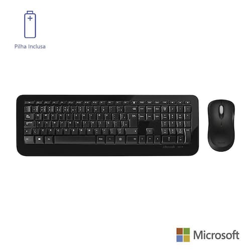 Microsoft Teclado e Mouse Sem Fio Desktop 850 USB Preto - PY900021Liberte-se dos fios!O Teclado e mouse microsoft wireless 850 é ideal para quem busca praticidade e facilidade por um preço acessível. Com a tecnologia sem fio, conectividade de 2.4Ghz, é possível utilizar os equipamentos em uma distância de até 5 metros do computador. Além disso, o design do mouse é ambidestro, para garantir o conforto para destros e canhotos.Possui espaço para duas pilhas AAA (teclado) e uma AA (mouse), com duração de até 15 meses sem precisar de troca. Para evitar que as pilhas descarreguem durante o uso, o teclado possui indicador de duração que fica vermelho quando a pilha está ficando fraca.A exclusiva tecnologia (AES) Advanced Encryption Standard protege tudo que for digitado, sem deixar com que nenhuma informação seja compartilhada pelo ar. Também possui teclas de acesso fácil, que oferecem as funções e atalhos mais comuns do Windows.Ficha TécnicaMarca: MicrosoftModelo: PY900021Conexão: Sem FioPeso do produto: 885.000gLargura do produto: 22.7cmAltura do produto: 4.57cmComprimento do produto: 48.6cmComposição do Material: PPVelocidade Sensor Mouse DPI:1200Compatibilidade: MacOS, Windows, Linux, AndroidConteúdo da Embalagem:1 Teclado Sem Fio; 1 Mouse Sem Fio;1 Micro USB; 1 Guia Rápido; 1 pilha AA; 1 pilha AAA Inclusas;* Imagens meramente ilustrativas.