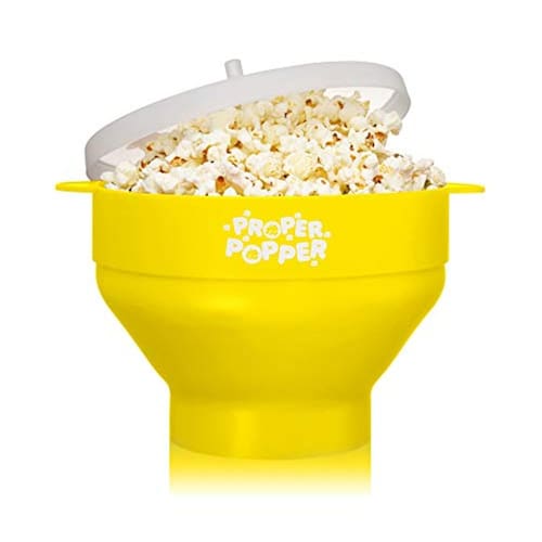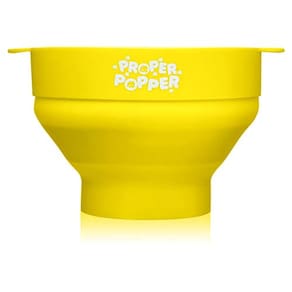 . A maneira "adequada" de fazer pipoca... O Proper Popper é o mais novo avanço na fabricação de pipoca do século 21. Como uma maneira mais rápida, saudável e conveniente de fazer pipoca, você pode colocar até 15 xícaras de pipoca fresca em apenas 2-4 minutos! Com o Proper Popper você pode evitar comer pipoca de micro-ondas amanteigada insalubre. Você pode eliminar o tempo de espera do fogão ou pipocas elétricas. Você também pode controlar o sabor de sua pipoca simplesmente adicionando suas próprias especiarias, óleo ou apenas grãos simples. É sua escolha - de qualquer forma, será ótimo! O processo é fácil... 1. Basta desdobrar a tigela de pipoca até o tamanho total e remover a tampa. 2. Adicione grãos até uma das duas linhas marcadas - dependendo de quanta pipoca você deseja estourar! 3. Se desejar, adicione qualquer tempero ou óleo desejado.4. Coloque suavemente a tampa de volta na tigela e aqueça no micro-ondas por 2-4 minutos. (os tempos de aquecimento variam dependendo da potência do seu micro-ondas) 5. Para melhores resultados, pare de micro-ondas quando estourar diminui para 2 a 3 segundos entre os pops. 6. Abra cuidadosamente o micro-ondas e retire a tigela usando as alças convenientes. Remova a tampa com cautela devido ao calor e vapor. Tigela, tampa e alças são QUENTES! Arrumar... Sentindo-se preguiçoso? Cofre para lava-louças! Evite a bagunça de esfregar panelas gordurosas e poppers elétricos. A alta qualidade 100% de silicone de grau alimentício Proper Popper é fácil de limpar. Faça um enxágue rápido com água e sabão ou jogue-o na máquina de lavar louça. A tigela é dobrável de 5,7 "a 2,2" para facilitar o armazenamento sem ocupar muito espaço na sua cozinha. Esta tigela é um ótimo item para viajar devido à sua conveniente tecnologia dobrável. Seja criativo... Existem muitas maneiras diferentes de usar o Proper Popper.You pode usar o chip e o recurso de imersão- Basta deixar a tigela colapsada e despejar o mergulho de sua escolha no centro da tigela. Coloque as fichas ao redor.