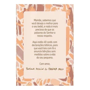 Mamãe, sabemos que você deseja o melhor para o seu bebê, e nada é mais precioso do que as palavras do Senhor a nosso respeito. Aqui estão 40 cards com declarações bíblicas, para que você leia com fé e anuncie bênçãos sem medidas sobre a vida do seu pequeno. Com amor,Tatiane Joslin & Fabiola Melo 42 cards sendo:• 1 card com apresentação do produto• 1 card com informações sobre as autoras• 40 cards com frases para declarar ao seu filho (1 para cada semana de gestação) Todos eles coloridos, frente e verso, com aplicação de verniz nas frases.