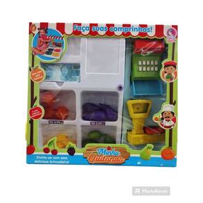 Vem com balança e uma máquina registradora, legumes e dinheirinhos.