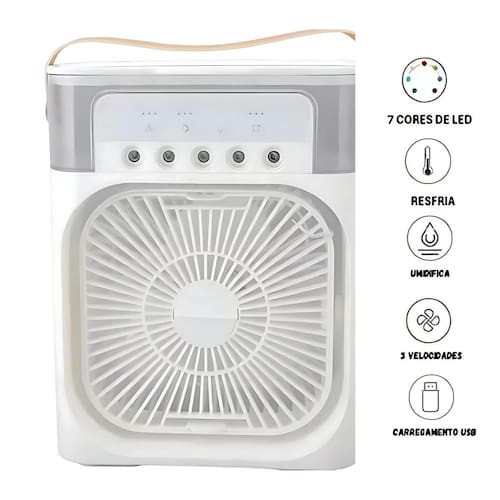 Mini ar condicionado de alta performance com função gelo e água Descrição do anúncio: O climatizador é a solução perfeita para proporcionar um ambiente mais fresco e agradável. Com três opções de vaporização e iluminação decorativa led, ele é ideal para quartos, escritórios e salas.