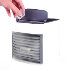 Antes de ligar seu mini ar condicionado, coloque água bem gelada e, se quiser, pode molhar as esponjas que ficam dentro e congelar para ter um ar mais gelado.