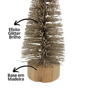 -01 Unidade Mini Pinheiro Decorativo Champanhe Glitter 16cm Base Madeira