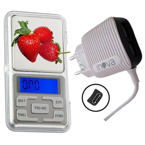 Mini Balanca De Precisao Portatil Para Ouro Joia Prata E Cozinha 0,1 A 500G Carregador De Celular Android Rápido Kit com Mini Balança e Carregador de Celular Micro Usb: Mini Balança Digital usado para pesar pequenos objetos como jóias e frutas, conta com função Tara e pesa em Gramas e Oz, têm alta precisão e visor digital lcd e botão para iluminação do visor no escuro. Sobre o produto:- Marca: Kapbom- Modelo: KA-B108- Cor: Prata- Material: Aço Inox- Com Tampa Protetora de Acrílico Removível- Alimentação: 2 Pilhas AAA (inclusas) Carregador: Carregue seus dispositivos de forma eficiente e segura. São 3.1a de potência com 2 Usb e conta com proteções contra Estática e Curto Circuito. Sobre o produto:- Marca: Inova- Modelo: CAR-9013- Cor: Branco- Compatível com qualquer dispositivo com Micro Usb- Carregue até 3 dispositivos ao mesmo tempo- A tensão é dividida entre os aparelhos conectados Itens inclusos:1 - Balança Digital de Bolso2 - Pilhas AAA1 - Carregador