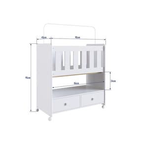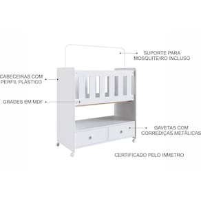 Mini berço Moisés com 1 prateleira e 2 gavetas na cor branca, com rodízios e grade fixa, produto compacto, permite utilização ao lado da cama dos pais, facilitando o acesso ao recém nascido. Produzido em MDP com suporte de lastro em madeira maciça, lastros em MDF 9mm e grade em MDF. Suporta até 20 kg, prateleira suporta até 10kg. Medidas do colchão(não acompanha): 85cmx38cm. Acabamento: Finish Foil Acabamento da Gaveta: Finish Foil Acabamento da Prateleira: Finish Foil Acompanha Cama Auxiliar: Não Acompanha Colchão: Não Acompanha Dossel: Não Acompanha Móbile: Não Acompanha Suporte para Mosquiteiro: Sim - Sem Véu Altura: 96 cm Altura do Estrado até o Chão: 57 cm Altura dos Pés: 6 cm Ambiente: Quarto Infantil Ambiente Principal: Quarto de Bebê Certificação Inmetro (Código): 0024762018 Certificado: 006634/2017 Complexidade da Montagem: Média: pode ser montado por mais de uma pessoa e/ou necessite de maior conhecimento para montagem Cor: Branco Cor: Branco Cor Flex: Não Cor Predominante: Branco Escala de Brilho: Fosco Escala de Brilho da Gaveta: Fosco Escala de Brilho da Prateleira: Fosco Espaço Entre as Barras das Grades: 6 cm Estilo: Moderno Estrado com Regulagem de Altura: Não Garantia do Fornecedor: 06 meses Gaveta com Chave: Não Itens Inclusos: Berço e Manual de Montagem Largura: 90 cm Manual de Especificação Técnica: Manual de Montagem e Instalação: https://cdn2.madeiramadeira.com.br/atributo/completa-moveis/893156-281708-1.pdf Material da Gaveta: MDP Material da Grade: MDF Material da Prateleira: MDP Material do Estrado: MDF Material do Puxador da Gaveta: Plástico Material dos Pés: Plástico Material Principal: MDP Montagem Flex: Não Multifunção Flex: Não Necessita Montagem: Sim Origem do Produto: Nacional Permite a Utilização de Cama Auxiliar: Não Peso: 19,5 kg Peso Máximo por Gaveta: 5 kg Peso Máximo por Prateleira: 10 kg Pintura Atóxica: Sim Portátil: Não Possui Gavetas: 02 Possui Pés: 04 Possui Portas: Não Possui Prateleiras: 01 Possui Rodízio: Sim Profundidade: 45 cm Recomendações de Uso, Manutenção e Limpeza: Limpar com pano seco ou levemente umedecido para retirar pó/sujeira. Não aplicar produtos abrasivos. Rodízio com Trava: Sim Sapatas Niveladoras: Não Sistema Anti-Refluxo: Não Sistema de Montagem: Parafusos, minifix, cavilhas. Suporta Até (kg): 20 kg Tamanho do Colchão Indicado (L x C): 85cm x 38cm Tipo de Berço: Mini Berço Tipo de Corrediça da Gaveta: Metálica Simples Tipo de Estrado: Fixo Tipo de Grade: Fixa Tipo de Puxador da Gaveta: Externo Ean: 7899671403448