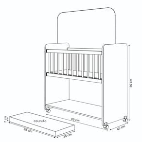 Largura (89 cm) e Profundidade (45 cm): Essas dimensões oferecem um bom espaço para o bebê dormir confortavelmente, sem ser excessivo, facilitando a adaptação do berço em quartos de diferentes tamanhos.