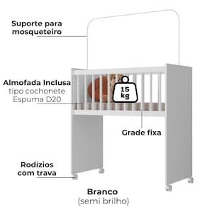 Mini Berço Encanto, desenvolvido para oferecer segurança e conforto ao bebê. Estrutura em MDP/MDF (6/12/15/25 mm) e acabamento UV. Composto por grade fixa não ajustável (MDF revestivo em PVC virgem) e suporte superior para mosquiteiro. Possui rodízios com trava e acompanha almofada tipo colchonete (espuma D20). Não acompanha pelúcias ou itens de decoração. Produto será entregue em 01 volume.
