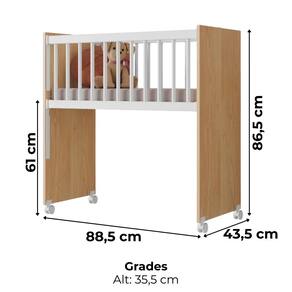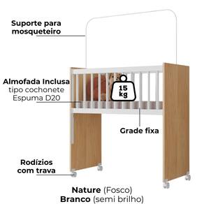 Mini Berço Encanto, desenvolvido para oferecer segurança e conforto ao bebê. Estrutura em MDP/MDF (6/12/15/25 mm) e acabamento UV. Composto por grade fixa não ajustável (MDF revestivo em PVC virgem) e suporte superior para mosquiteiro. Possui rodízios com trava e acompanha almofada tipo colchonete (espuma D20). Não acompanha pelúcias ou itens de decoração. Produto será entregue em 01 volume.