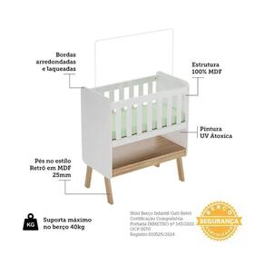 O Mini Berço Guti Retro Peroba com Colchão Incluso, 3 em 1miniberço, mini escravaninha e mini aparador, com suporte Mosquiteiro, Cor Branco com Amendoa, referência 6535.87. Idealideal para mães que buscam segurança do seu bebê para um sono de qualidade e revigorante independente do momento do dia/noite. Ele é perfeito para quem busca um estilo único e sofisticado, que combina o design retro com a modernidade que você merece. Combina com diversas ocasiões, este miniberco é a escolha perfeita para quem deseja se destacar. Material 100% MDF, pés em MDF estilo Retrô, suporte para fraldas,bordas arredondadas nos cantos.Materiais de Alta QualidadeFabricado com materiais selecionados, garantindo durabilidade e resistência ao longo do tempo.