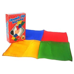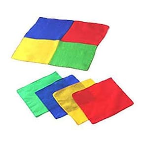 O mágico mostra 4 lenços de seda pequenos com 4 cores diferentes vermelho, azul, amarelo e verde Os lenços são colocados no punho da mão esquerda mas quando abre a mão novamente aparece um lenço maior com os 4 lenços pequenos costurados.