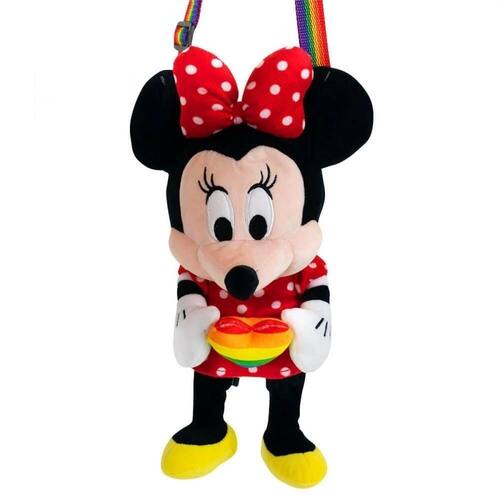 Pequena bolsa fechamento a zíper no formato de pelúcia da Minnie de 20 cm de altura (medida sentado). As pernas são soltas, podendo ficar estendidas. Quando colocado na superfície fica sentado. Minnie está segurando um coração na cor arco-íris, combinando com a alça removível da mesma cor. Coleção orgulho LGBT+. Material: poliéster; Enchimento: fibra de poliéster; Produto certificado por Órgão acreditado pela CGCRE do INMETRO