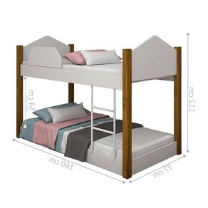 Ela vem com escada, grade de proteção lateral na cama superior. Acomoda colchões de 150 x 70 cm.