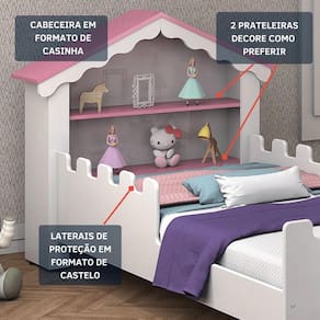 A cama juvenil Magia tem o objetivo de levar os sonhos de suas pequenas para os contos de fada e é perfeita para o quarto da sua filha, com design inovador ela foi projetada para oferecer conforto e segurança para a criança, suas laterais possuem barras de proteção em formato de castelo que além de dar um toque super delicado tem a finalidade de evitar quedas, possui prateleira na cabeceira para guardar brinquedos ou decorações. A cama é produzida em mdf para oferecer maior qualidade e resistência.