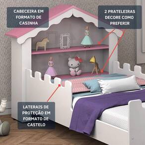A cama juvenil Magia tem o objetivo de levar os sonhos de suas pequenas para os contos de fada e é perfeita para o quarto da sua filha, com design inovador ela foi projetada para oferecer conforto e segurança para a criança, suas laterais possuem barras de proteção em formato de castelo que além de dar um toque super delicado tem a finalidade de evitar quedas, possui prateleira na cabeceira para guardar brinquedos ou decorações. A cama é produzida em mdf para oferecer maior qualidade e resistência.