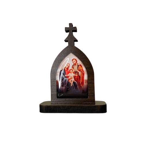 A peça na marrom escura possui a imagem resinada da Sagrada Família de Nazaré (Nossa Senhora sentada com o Menino Jesus em seu colo e São José em pé olhando para a criança, assim como Maria).