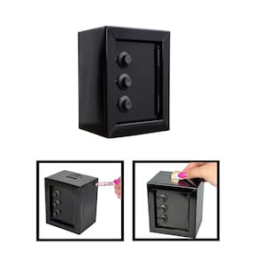 - Tamanho: 8cm de comprimento x 10cm de largura x 12,5cm de altura.- Com segredo.- Entrada para moedas e notas.- Material: Aço e Plástico. - Cor: preto Marca: Não Informado