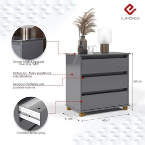 A Mini Cômoda foi desenvolvida e elaborada para levar um novo conceito de decoração para seu quarto. Ela irá promover a otimização do espaço, criar o efeito de acolhimento e aumentar a sensação de bem-estar ao ambiente. A cômoda possui 3 gavetas de amplo espaço, corrediças Telescópicas e pés em madeira maciça, que proporcionam ótima sustentabilidade e durabilidade ao móvel. Com a Mini Cômoda, seu quarto estará completo e seus pertences organizados e sempre à mão.