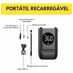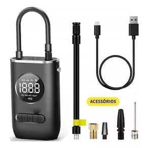 Mini Compressor Calibrador de Ar Digital Recarregável - Mantenha-se Preparado para Viagens sem Preocupações Compressor Portátil com bateria interna de 2000mah Recarregável, com visor digital . 1 - Sem fio, não necessita de conexão ao acendedor de . 2 - Compacto - Cerca de Altura 13,7 cm X Largura 8,9 cm, O tamanho é equivalente a um Smartphone com tela de 4,7, podendo caber facilmente no porta luvas, na moto ou em sua mochila. 3 - Leve - Peso de cerca de 395 gramas. 4 - Possui uma pequena lanterna para operação em locais de baixa iluminação. 5 - Interface de carregamento via cabo USB - Type C , mais rápido que os tradicionais incluso no kit . 6 - Acompanha bico para pneu com rosca sem perigo de soltar como as de alavanca , bico de pneu rápido, bico para bola, 2 bicos para infláveis e cabo de carregamento. OBS: Pausar por 5 minutos depois de usar por 10 minutos. Caso contrário, a temperatura crescente do escudo de metal danificará o motor. Especificação: Material: ABS 10A Tensão: 7,4V Potência: 50W Fluxo de ar: 25L / min Tipo de fonte de alimentação: TYPE-C Comprimento do cabo de alimentação: 0,8 metros Comprimento do tubo inflável: 0,5 Marca: Não Informado