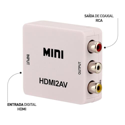 Mini Conversor Hdmi Para Vídeo Composto rca Ligue seu video game, notebook, dvd, sistema de câmeras, ou quaquer outro dispositivo que possua saída HDMI diretamente em televisores ou monitores que ainda utilizam a entrada AV Composite RCA com facilidade utilizando esse Mini Conversor HDMI para Vídeo Composto RCA . Tenha imagens nítidas e com qualidade de áudio. Imagens Full HD de 1080p. Basta ligar o cabo HDMI na porta de entrada do conversor, e, em seguida, ligue um cabo de Áudio e Vídeo Composto padrão RCA-amarelo, vermelho e branco do conversor para a TV. É necessário ligar o cabo USB já incluso para fornecimento de energia. Especificações: Cor: Branco Entrada: HDMI Saída: AV RCA, Composite, CVBS Resoluções: 1080p / 720p Peso: 60g Dimensões: 6 x 5 x 2cm Conteúdo da Embalagem: 1 Adaptador HDMI para Áudio e Vídeo RCA, Composite, CVBS 1 Cabo USB 1 Manual - Este produto não é compatível com DVR. Atenção: Verifique a compatibilidade com seu equipamento antes da compra, não nos responsabilizamos por incompatibilidades. Homologação Anatel: 136132205567