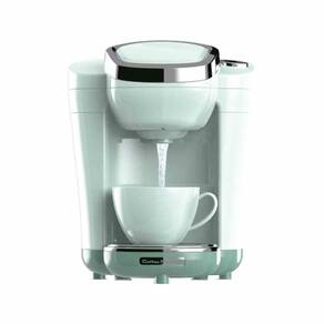 A lâmpada vermelha atrás dela pisca e depois que o café fica pronto, ouve-se o som de água saindo do aparelho.