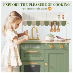 MATERIAIS PREMIUM PARA BRINCAR: A cozinha de brinquedo da ROBUD é feita com madeira premium cuidadosamente selecionada e tinta atóxica. Construída para mãos pequenas, as crianças podem desfrutar plenamente do tempo de brincadeira em uma cozinha projetada para seu bem-estar e segurança. COZINHA REAL, DIVERSÃO REAL: Este conjunto de cozinha de brincar tem tudo! Com pia e torneira, forno, prateleiras, armários e todos os utensílios de cozinha básicos, é como uma versão em miniatura de uma cozinha real. As crianças podem mergulhar em seu mundo de culinária imaginária, preparando pratos, organizando e limpando como adultos! DESIGN ENCANTADOR COM UM TOQUE ESPECIAL: Com sua adorável torneira dourada, esta cozinha de brincar não é apenas divertida, mas também elegante! É uma adição encantadora a qualquer ambiente, tornando o tempo de brincadeira ainda mais mágico, enquanto embeleza sua casa. APRENDER BRINCANDO: Com esta cozinha de brincar, as crianças podem explorar a independência! É uma forma lúdica de aprender responsabilidade, desde organizar os ingredientes até arrumar. Elas até terão um começo divertido com a segurança alimentar! ORGANIZADA E COMPACTA: Perfeita para salas de brinquedo ou quartos, esta cozinha de brincar é projetada com armários de armazenamento para manter tudo organizado. Quando a brincadeira acaba, tudo pode ser guardado, deixando o ambiente tão arrumado quanto antes.