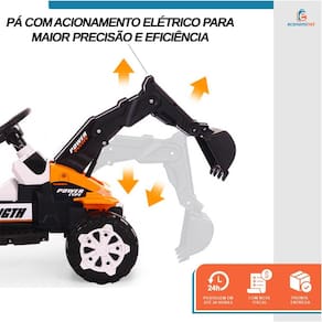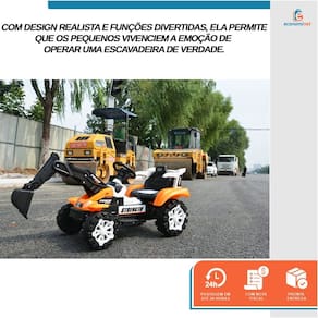 Benefícios: Segurança e Estabilidade: Rodas de EVA resistentes e estrutura leve, ideal para o público infantil. Diversão Garantida: Suporte para MP3 e pá com acionamento elétrico que tornam a brincadeira ainda mais interativa e divertida. Controle Simples: Velocidade ajustada para segurança, garantindo uma experiência intuitiva e tranquila. Estilo e Realismo: Design de escavadeira com pá funcional, estimulando a imaginação e promovendo brincadeiras criativas.