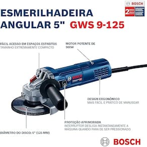 Descrição: A Esmerilhadeira Angular Bosch GWS 9-125 oferece 900 Watts de potência, sendo ideal para cortar e desbastar metais como ferro e aço. Com o acessório certo, ela também realiza cortes precisos em alvenaria e concreto. Sua capa de proteção de 5 (125 mm), fixada por parafuso, garante que não se desloque em caso de quebra do disco, aumentando a segurança do operador.
