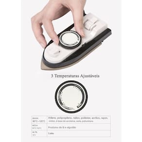 O mini ferro possui 3 temperaturas ajustáveis. Baixa (80C-120C), Média (140C-160C) e Alta (180C). Aquece rapidamente.
